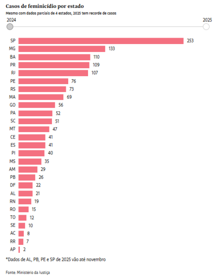 No total, 15 estados tiveram crescimento nos casos de feminicídio entre 2024 e 2025. Estados do Norte e do Nordeste concentram as maiores altas percentuais. Em contraste, 11 estados registraram redução no número de ocorrências em 2025.