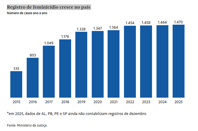 O Brasil registrou um novo recorde de feminicídios em 2025, com ao menos 1.470 ocorrências em todo o país, segundo dados do Ministério da Justiça e Segurança Pública. Desde a tipificação do crime, em 2015, 13.448 mulheres foram vítimas no território nacional.